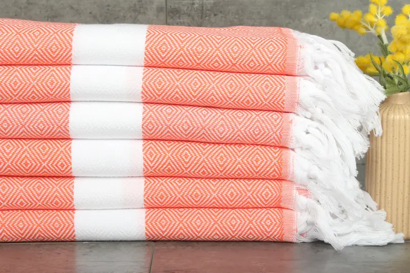 Composed of 100% organic Turkish cotton, the towels exhibit a natural fiber composition, ensuring durability and breathability. Resulting in high absorbency, the cotton fibers enhance water retention after each wash, making them ideal for various household uses. Characterized by dimensions of 40x71 inches/100x180 centimeters, these towels weigh 360 grams, with slight tolerances due to hand-weaving of up to 1-2.5 centimeters.