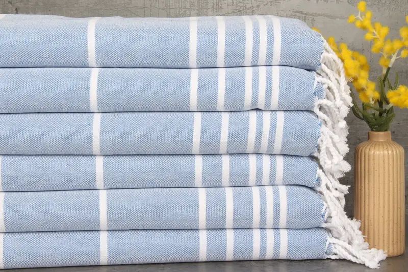 The Turkish Towels are crafted from 100% organic Turkish cotton, ensuring a superior level of absorbency and softness. These towels weigh 122 grams, and their dimensions are specified as 18x38 inches or 45x95 centimeters. Tolerance for hand-weaving variations is within 1-2.5 centimeters.