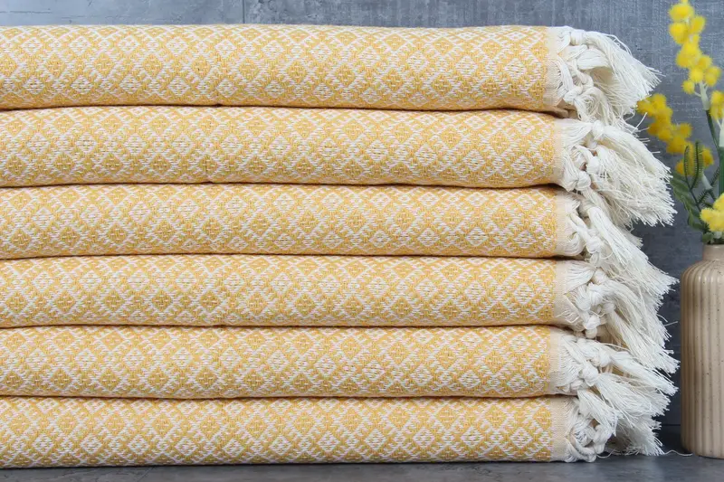 The Turkish Towels are composed of 100% organic Turkish cotton, ensuring superior absorbency and softness. Characterized by a weight of 100 grams and a size of 20x38 inches or 50x95 centimeters, these towels exhibit a hand-weaving tolerance of 1-2.5cm. Dimensions and weight may slightly vary.