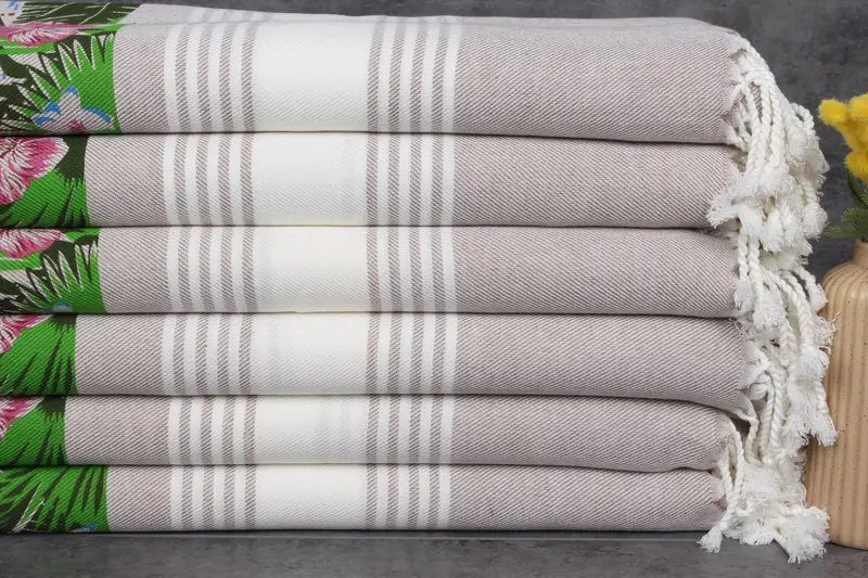 Turkish towels, renowned for their absorbency and durability, are crafted from 100% organic Turkish cotton, ensuring superior softness and functionality. Characterized by their meticulous hand-weaving, these towels exhibit tolerances of 1-2.5cm in dimensions, providing a natural variance. Measuring precisely 36x71 inches (90x180 centimeters) and weighing 300 grams, they offer a balance of size and lightness for various uses.