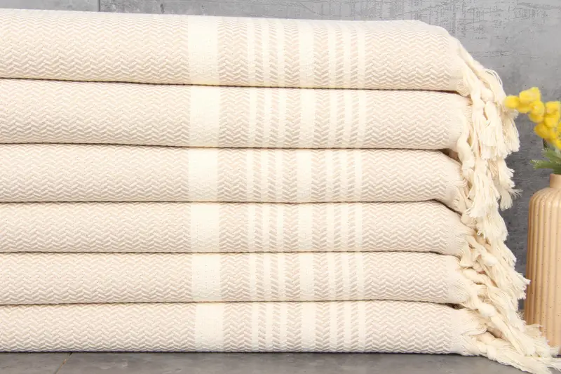 Ensuring superior absorbency, the Turkish towels are characterized by their 100% organic Turkish cotton composition, naturally dyed and pre-shrunk. Resulting in a weight of 112 grams, these towels feature dimensions of 18x40 inches or 45x100 centimeters, with slight hand-weaving tolerances of up to 1-2.5 centimeters. Hand-loomed production capacity allows for customization of both design and size, with bulk orders benefiting from additional discounts.