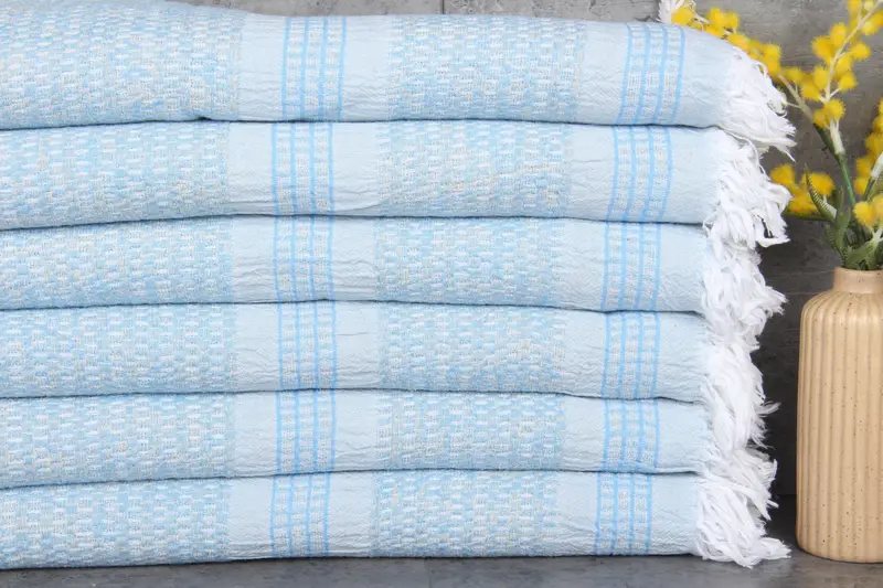 Ensuring product quality, these towels are woven from 100% organic Turkish cotton, characterized by natural dye colors. Weighing 320 grams and measuring 36x71 inches (90x180 centimeters), the towels provide high absorbency and are pre-shrunk with a hand-weaving tolerance of 1-2.5cm. Resulting in superior softness, the towels offer versatile applications from beach use to home decor.