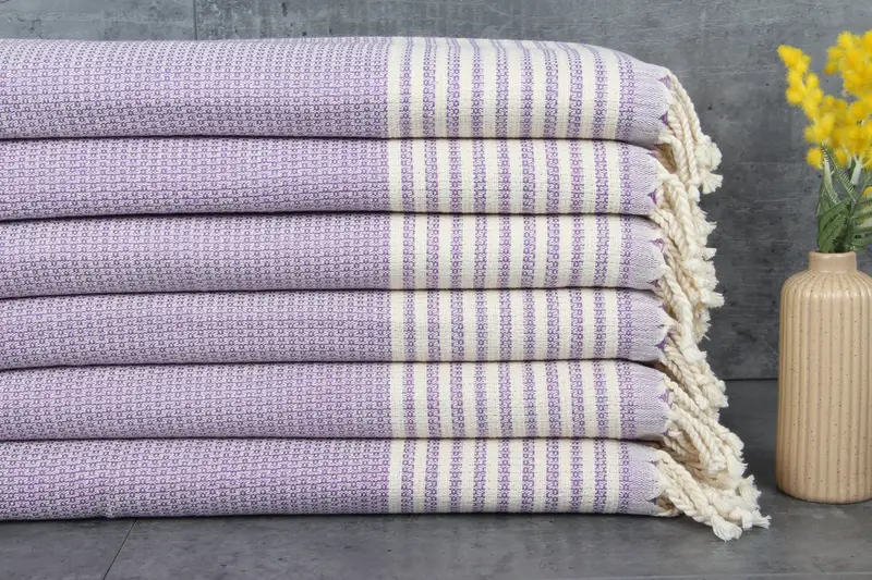 Turkish towels are characterized by their 100% organic Turkish cotton composition, ensuring natural absorbency. These towels have a weight of 220 grams per square meter, offering durability and softness. Organic cotton towels and throws typically range from 40x70 inches to 100x180 centimeters, with hand-weaving tolerances of 1-2.5 cm.