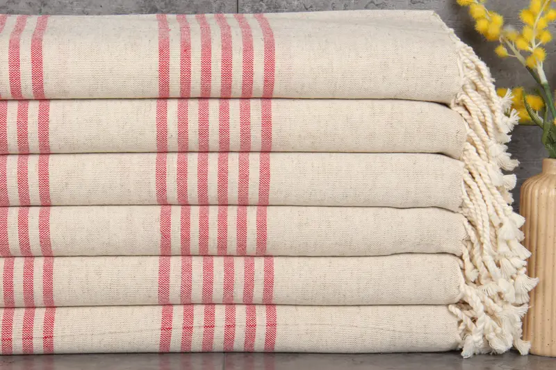 The Turkish towels are characterized by their 100% organic Turkish cotton composition, ensuring high absorbency and durability. Each towel, measuring 40x71 inches (100x180 centimeters) with a weight of 280 grams, demonstrates excellent hand-weaving tolerances within 1-2.5 centimeters. These towels are meticulously crafted to be pre-shrunk, reducing the likelihood of future shrinkage.