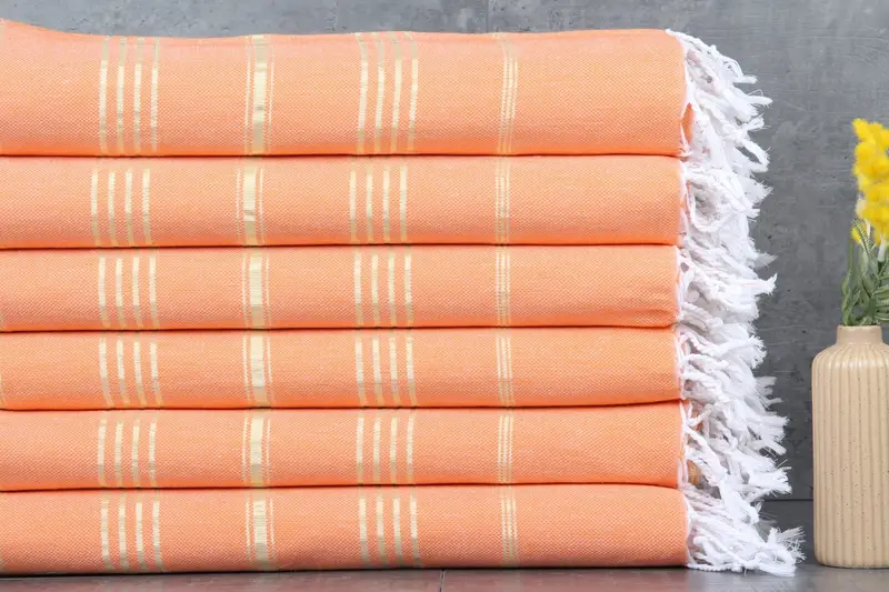 The Turkish towels are crafted from 100% organic Turkish cotton, ensuring their natural and vibrant colors. Resulting in a towel that is highly absorbent, these towels are characterized by increased water retention with each wash. Measuring 40x71 inches or 100x180 centimeters, each towel weighs 265 grams, exhibiting a hand-woven tolerance of 1-2.5 cm.