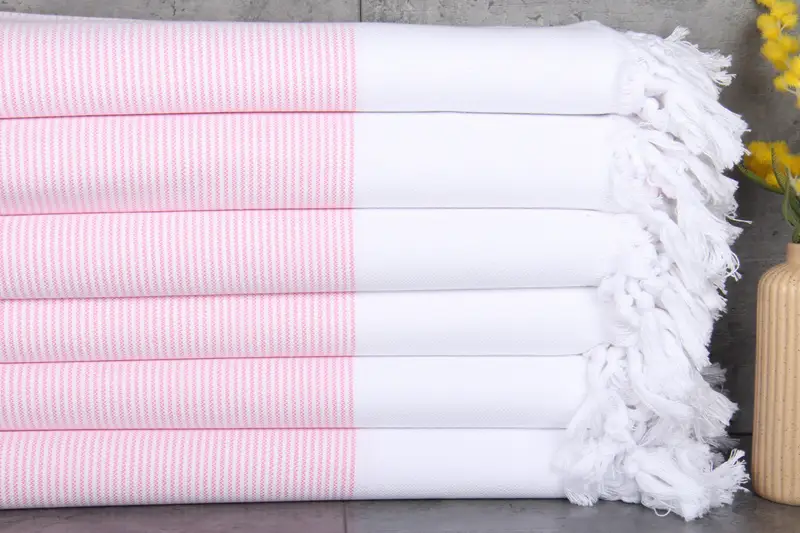 Turkish towels are distinguished by their use of 100% organic Turkish cotton, ensuring natural dyeing and superior absorbency. Characterized by a 40x71 inches/100x180 centimeters dimension, each towel weighs 290 grams, with hand-weaving tolerances of 1-2.5 centimeters. Pre-shrunk and designed for repeated use, these towels become increasingly absorbent with each wash.