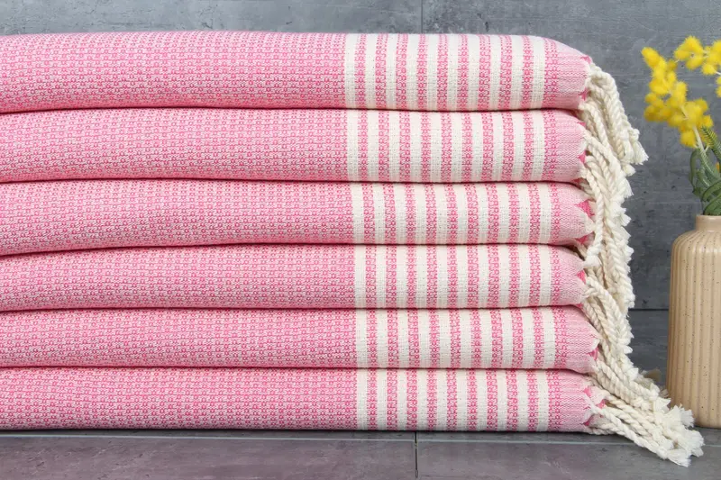 The Turkish towels are characterized by their use of 100% organic Turkish cotton, resulting in a high GSM of 220 grams per square meter. The towels exhibit a notable absorbency, enhanced with each wash, making them increasingly effective over time. The product dimensions range from 40x70 inches to 22x44 inches, ensuring suitability for various applications such as beach, bath, and kitchen towels.