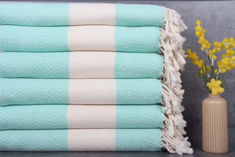 Our Turkish towels, blankets, and hand towels are made from 100% organic Turkish cotton, ensuring natural dye coloration and enhanced absorbency. Characterized by their fiber composition, these products offer superior absorbency. Each towel, blanket, or hand towel measures 38x67 inches or 95x170 centimeters, with a weight of 350 grams, providing a balance of durability and comfort. Hand-weaving techniques result in tolerances of 1-2.5cm, reflecting the artisanal quality.