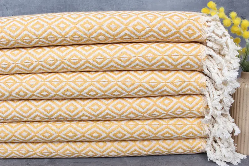 The Turkish towels, blankets, and hand towels are crafted from 100% organic Turkish cotton, ensuring a high-quality fiber composition. Characterized by natural dyeing, these towels achieve a weight of 440 grams and dimensions of 40x71 inches or 100x180 centimeters, with allowable hand-weaving tolerances of 1-2.5cm.