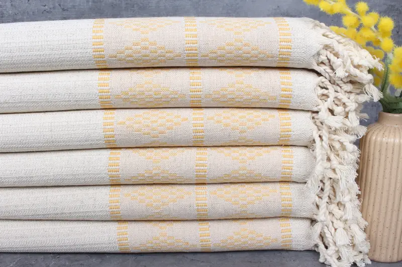 Crafted from 100% organic Turkish cotton, these towels exhibit enhanced absorbency and durability, ensuring superior performance in various applications. Characterized by a weight of 480 grams, they measure 36x71 inches or 90x180 centimeters, with hand-weaving tolerances allowing for variations of 1-2.5 cm.