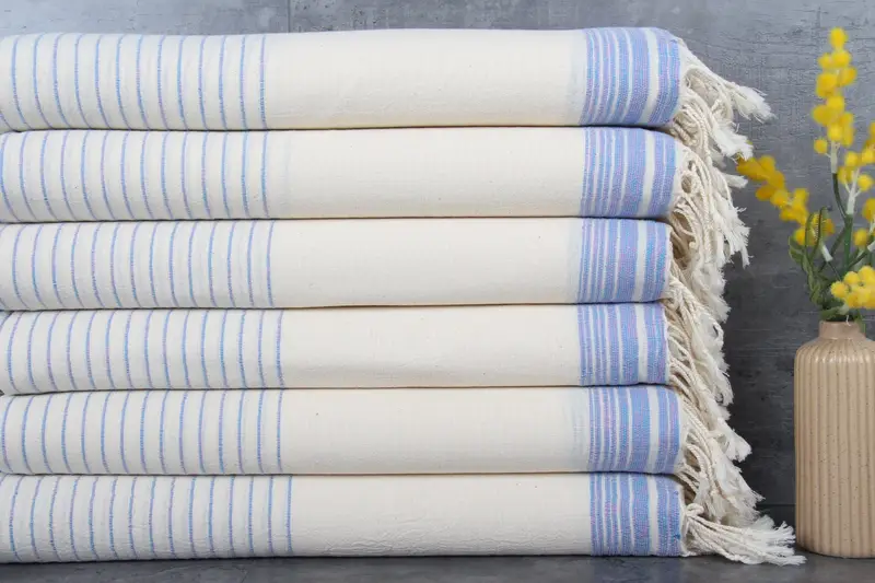 The product is characterized by its fiber composition, made entirely from 100% organic Turkish cotton, ensuring superior durability and absorbency. Each piece, measuring 36x67 inches or 90x170 centimeters, with a weight of 200 grams, showcases meticulous hand-weaving, resulting in tolerances of 1-2.5 cm. Embroidery customization options are available, and the towels are pre-shrunk, maintaining their shape after washing.