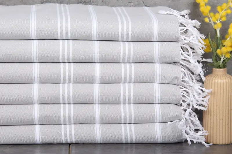 Turkish hand towels are crafted from 100% organic Turkish cotton, ensuring softness and durability. Characterized by a size of 24x40 inches or 60x100 centimeters, each hand towel has a weight of 100 grams, resulting in optimal absorbency. Hand-weaving allows for slight variations of up to 1-2.5 cm in dimensions.