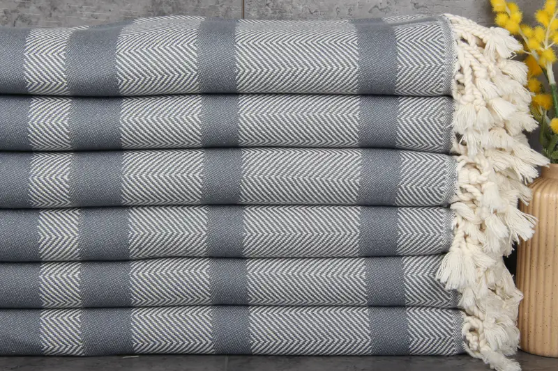Turkish Towels are characterized by their composition of 100% organic Turkish cotton, ensuring their natural dye colors and high absorbency. Each towel or blanket weighs 400 grams and measures 38x67 inches or 95x170 centimeters, with hand-weaving variations of 1-2.5 cm. These towels are pre-shrunk and designed to become more absorbent with each wash.