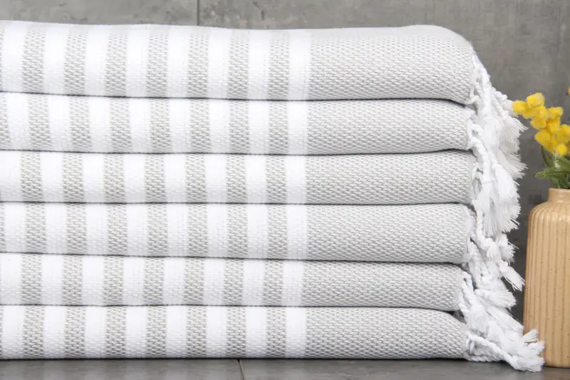 Characterized by 100% organic Turkish cotton, these towels are noted for their natural dyes and superior absorbency. Ensuring consistent quality, these towels come with a weight of 140 grams, measuring 24x44 inches or 60x110 centimeters, with hand-weaving tolerances of 1-2.5cm. Resulting in a pre-shrunk status, they require separate washing for the first 2-3 uses before mixing with other laundry, ideally at 30-40°C using low cycles and air drying.