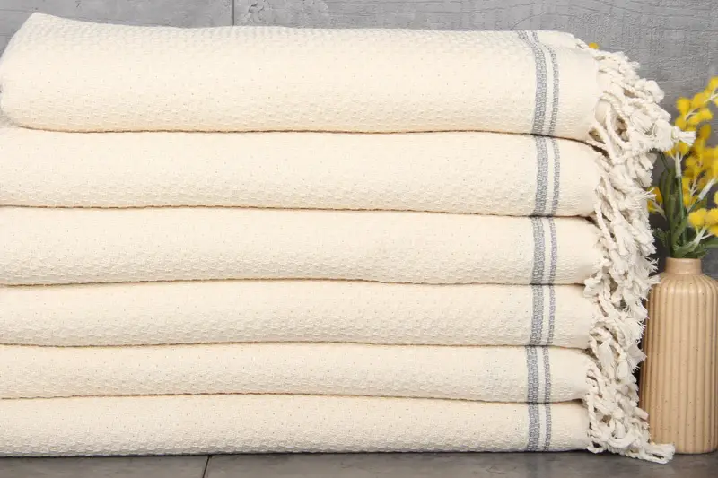 Ensuring superior quality, these beach towels are crafted from 100% organic Turkish cotton. Characterized by their natural dyeing process, these towels offer exceptional absorbency, enhanced after each wash. Weighing 440 grams, they exhibit a weighty feel and durability, ensuring longevity with each use.