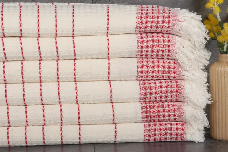 Turkish towels are composed of 100% organic Turkish cotton, ensuring high absorbency and durability. Resulting in towels that are naturally dyed, their fibers absorb water effectively with each wash, enhancing absorption over time. Each towel measures 40x71 inches or 100x180 centimeters and weighs 420 grams, with hand-weaving tolerances of 1-2.5 cm.
