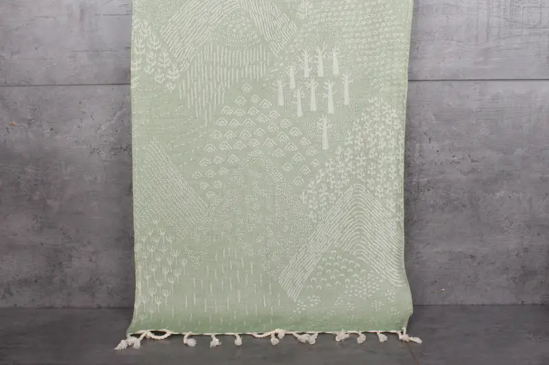 The Mountain Design Dish Towel is characterized by its 18x36 inches (45x90 centimeters) dimensions, ensuring a substantial surface area for various uses. It is crafted from 100% organic Turkish cotton, resulting in a weight of 100 grams and enhancing its absorbency. The hand-weaving process allows for slight dimensional variations of 1-2.5 cm.