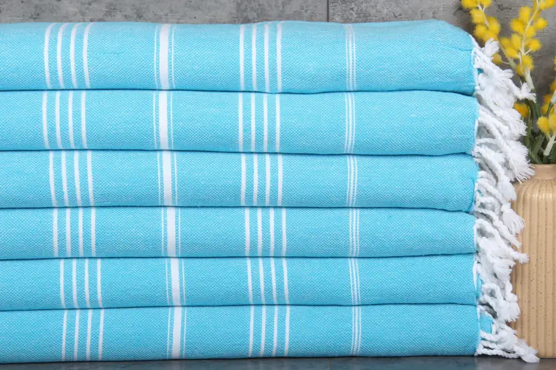 Turkish towels are characterized by their 100% organic Turkish cotton composition, ensuring superior absorbency and softness. The towels, sized at 40x71 inches or 100x180 centimeters, have a weight of 290 grams, allowing for a balance between lightness and durability. Fabric integrity remains robust under hand-weaving techniques, with slight variations of 1-2.5cm due to manual production.