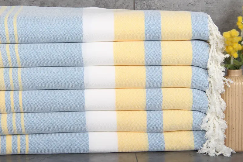Characterized by their 100% organic Turkish cotton composition, these towels exhibit high absorbency and softness. Weighing 250 grams, the towels provide a durable and plush texture. Each towel measures 40x75 inches or 100x190 centimeters, featuring natural dyeing techniques that ensure vibrant colors with minimal environmental impact.
