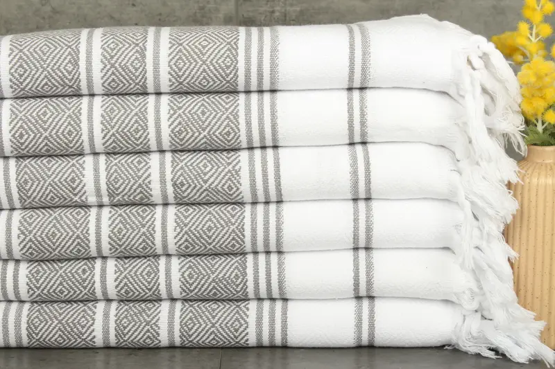 The 18x40 inch (45x100 centimeters) dish towel is characterized by its 100% organic Turkish cotton composition, ensuring superior absorbency and durability. Weighing 110 grams, the towel offers a balance of softness and robustness, with a natural dyeing process enhancing its aesthetic appeal. Hand-weaving tolerances for dimensions are approximately 1-2.5 cm, ensuring consistency in product quality.
