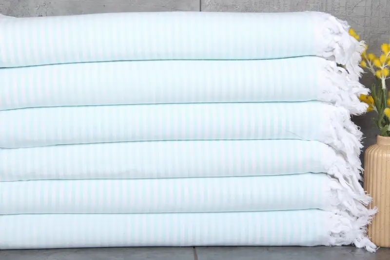 The Turkish towels are characterized by their %100 Organic Turkish Cotton composition, ensuring high absorbency. The towels measure 36x67 inches or 90x170 centimeters, and weigh 200 grams, with slight hand-weaving tolerances of 1-2.5cm. Embroidery customization is available, with a minimum order of 500-1000 pieces per design, depending on the complexity. Pre-shrunk and ready for use, these towels can be shipped internationally within 2-6 days, with free shipping for orders over 35 USD. Orders are shipped from either a US or Turkish warehouse, d...