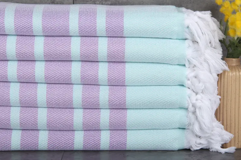 Turkish Towels are characterized by their superior fiber composition of 100% organic Turkish cotton, ensuring hypoallergenic properties and a soft texture. These towels are meticulously woven, resulting in a weight of 380 grams and dimensions of 36x67 inches (90x170 centimeters). Each towel exhibits a tolerance of 1-2.5cm in hand-weaving.