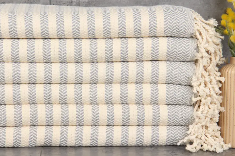 Characterized by their exceptional fiber composition, the Turkish Beach Towel is crafted from 100% organic Turkish cotton, ensuring superior absorbency and natural color retention. Resulting in a towel that is both luxurious and environmentally friendly, each towel boasts a weight of 440 grams and dimensions of 40x71 inches (100x180 centimeters). Tolerances for hand-woven towels range between 1-2.5 centimeters.