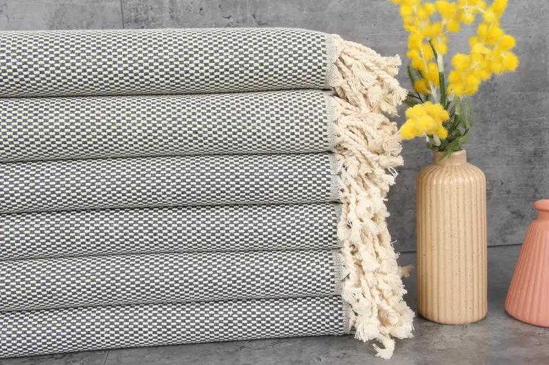 Turkish beach towels are composed of 100% organic Turkish cotton, ensuring superior absorbency and durability. These towels are characterized by a GSM of 220 grams per square meter and have dimensions of 40x70 inches or 100x180 centimeters. Tolerances for hand-weaving are within 1-2.5 cm, ensuring consistency in each piece.