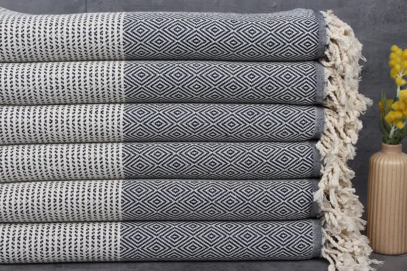 Fiber composition of Turkish towels is characterized by 100% organic Turkish cotton, resulting in a natural dyeing process. Ensuring superior absorbency, each piece is naturally dyed and pre-shrunk, with dimensions of 40x71 inches or 100x180 centimeters and a weight of 410 grams. Hand-weaving tolerances may vary by 1-2.5cm.