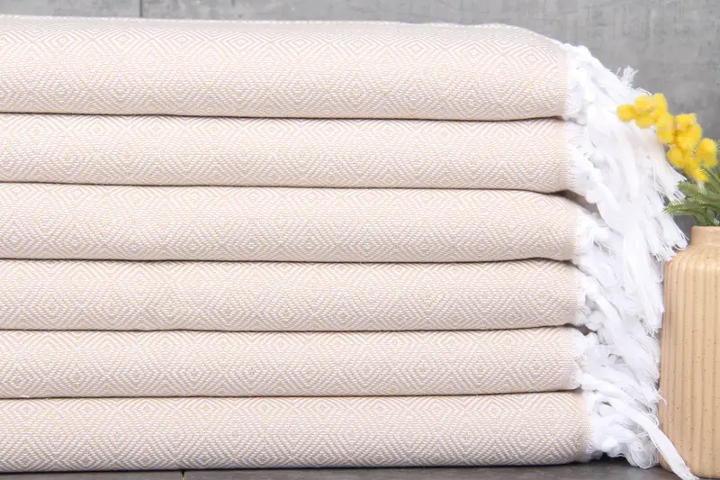 Turkish towels are characterized by their superior absorbency, resulting from their composition of 100% organic Turkish cotton. These towels are hand-woven, weighing 100 grams and have dimensions of 18x40 inches or 45x100 centimeters. The hand-weaving process allows for a tolerance of 1-2.5 cm in dimensions.