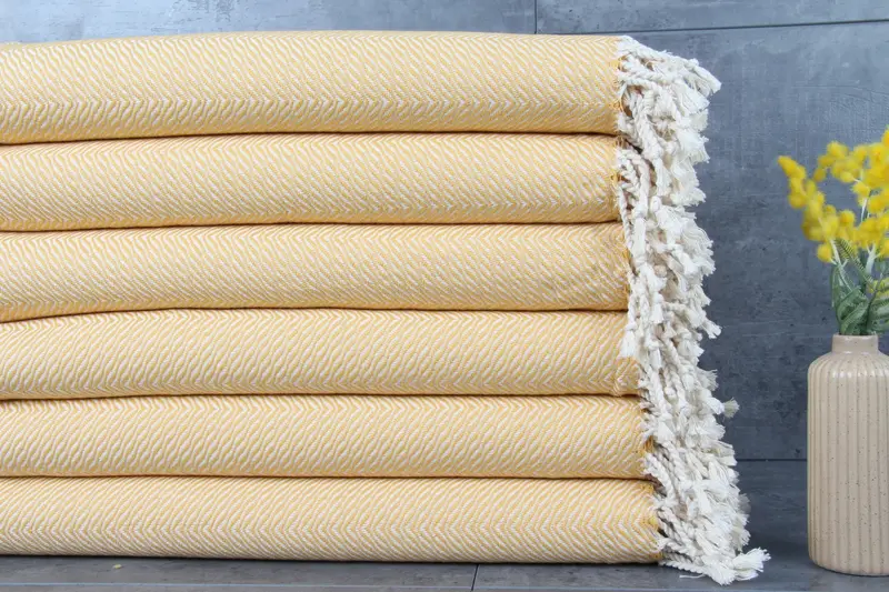 Turkish towels are characterized by their 100% organic Turkish cotton composition, ensuring superior absorbency and durability. Each towel weighs 400 grams and measures 40x71 inches or 100x180 centimeters, with hand-weaving tolerances of 1-2.5 centimeters. The towels are pre-shrunk and designed for multiple washes, enhancing their absorbency with each use.