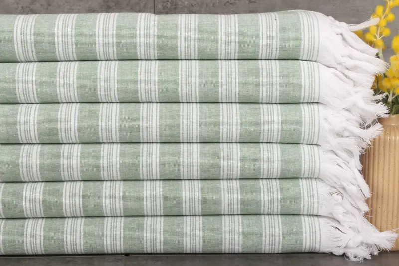 Turkish towels are characterized by their use of 100% organic Turkish cotton, ensuring natural color and superior absorbency. They are typically sized at 40x71 inches or 100x180 centimeters, weighing 210 grams. Hand-weaving tolerances allow for variations of 1-2.5 centimeters in dimensions.