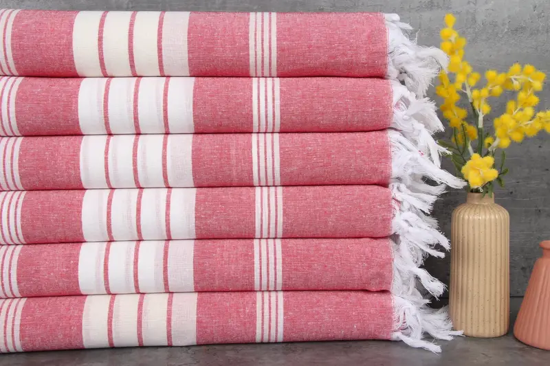 Made with 100% organic Turkish cotton, these towels are characterized by their high absorbency and softness. The towels are woven on hand looms, ensuring a GSM of 120 grams per square meter and a natural, unbleached finish. Each piece measures 40x70 inches or 100x180 centimeters, with hand-weaving tolerances of 1-2.5 cm.