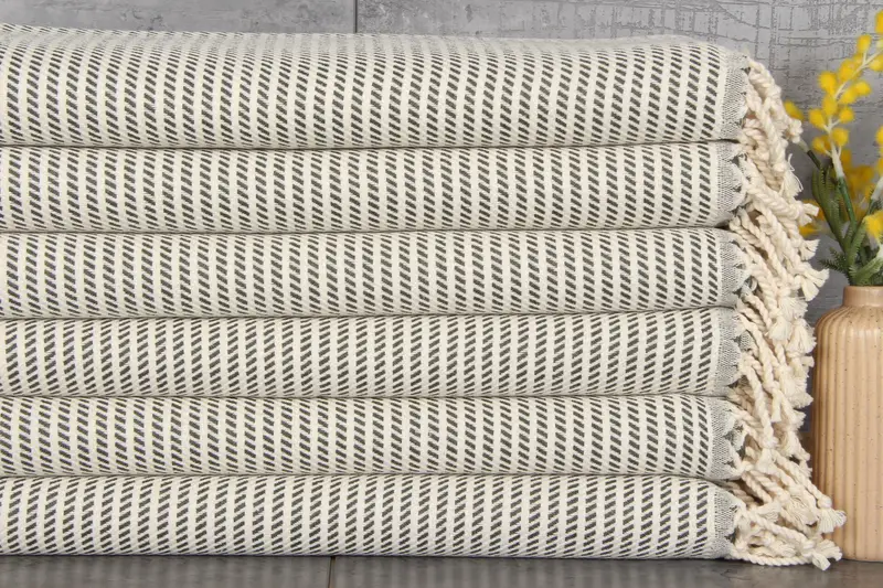 The Turkish towels are comprised of 100% organic Turkish cotton, ensuring high absorbency and durability. Characterized by a fiber composition that enhances water retention, these towels feature dimensions of 20x40 inches or 50x100 centimeters, with a weight of 122 grams per square meter. The hand-weaving process allows for tolerances of 1-2.5cm, resulting in unique variations.