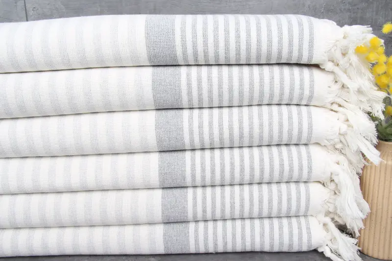Ensuring premium quality, Turkish towels exhibit a blend of 100% organic Turkish cotton, characterized by natural dye coloring. Resulting in high absorbency, these towels are meticulously woven with hand looms, each piece weighing 430 grams and measuring 38x67 inches (95x170 centimeters), with variations up to 1-2.5 cm due to hand-weaving. Pre-shrunk prior to delivery, these towels are ready for immediate use. Shipments are secured by eco-friendly packing materials, with global delivery times varying from 2-6 days based on location. Customizati...