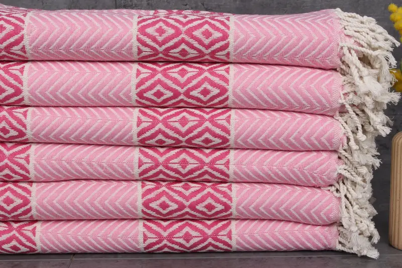 Characterized by their construction, the Turkish towels are composed of 100% organic Turkish cotton, naturally dyed and known for their high absorbency. Ensuring optimal softness, the towels measure 40x71 inches or 100x180 centimeters, weighing 430 grams each. Hand-woven with precision, they exhibit tolerances of 1-2.5 cm in dimensions.
