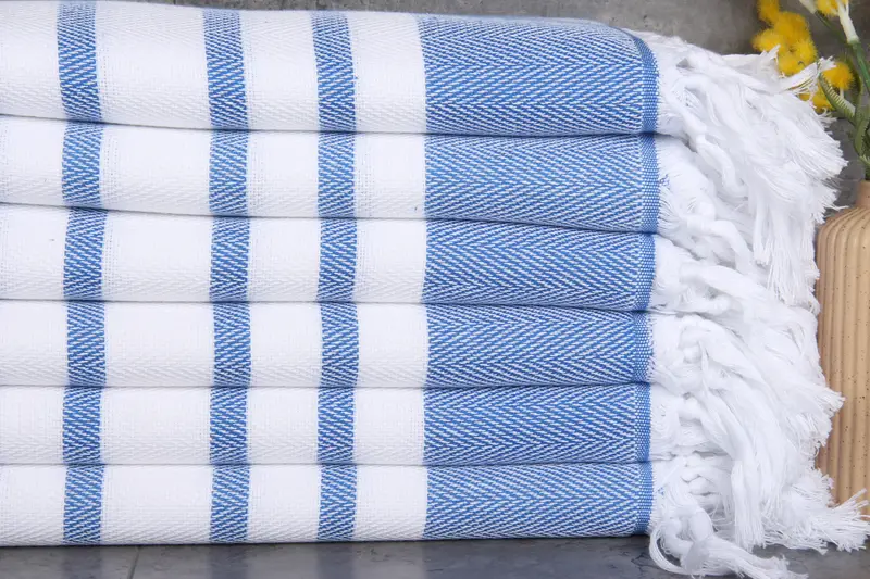 Turkish towels are characterized by their 100% organic Turkish cotton composition, ensuring superior absorbency and durability. These towels measure 36x67 inches (90x170 centimeters) and have a weight of 380 grams, with hand-weaving tolerances of 1-2.5 cm. Embroidery customization options are available, and the towels are pre-shrunk to maintain their size after washing.
