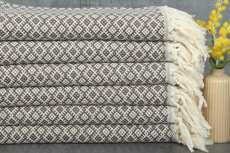 Turkish towels are woven from 100% organic Turkish cotton, ensuring high absorbency and durability. Characterized by their natural fiber composition, these towels absorb water more efficiently with each wash, resulting in increased absorbency. Each towel measures 40x71 inches (100x180 centimeters), weighs 450 grams, and tolerates a hand-weaving deviation of 1-2.5 cm.
