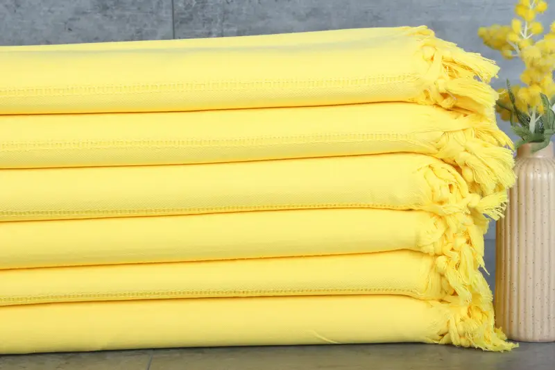 Turkish towels and blankets are crafted from 100% organic Turkish cotton, ensuring high absorbency and durability. Resulting in towels measuring 40x67 inches (100x170 centimeters) and weighing 290 grams, the cotton fibers are naturally dyed and pre-shrunk, becoming more absorbent with each wash. Hand-weaving introduces tolerances of 1-2.5 cm in dimensions.