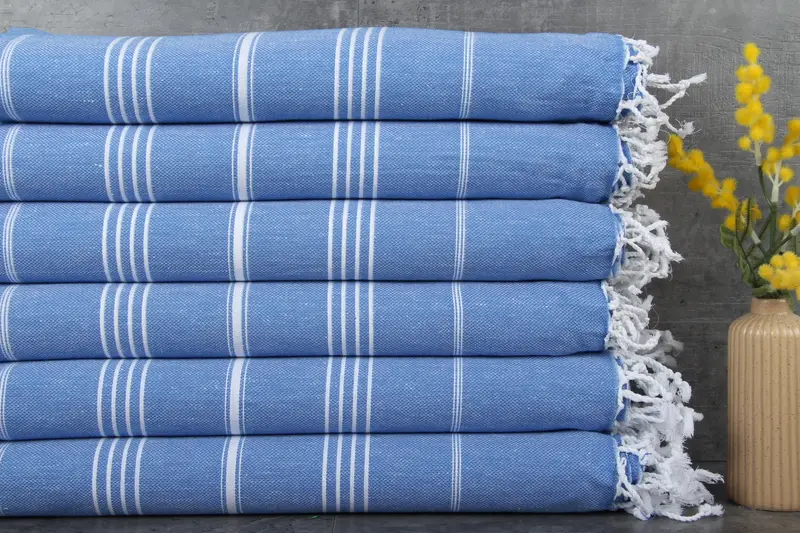 The Turkish towels are crafted from 100% organic Turkish cotton, ensuring natural dye coloring. Characterized by their weight of 265 grams and dimensions of 40x71 inches or 100x180 centimeters, these towels are hand-woven with a tolerance of 1-2.5cm. Each wash enhances their absorbency, resulting in improved water retention over time.