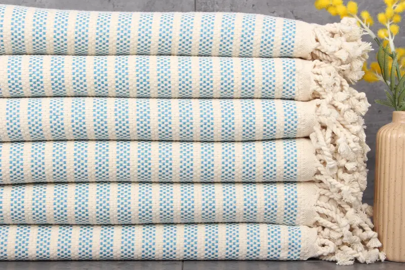 These towels are characterized by their 100% organic Turkish cotton composition, ensuring superior absorbency and a softer feel. They exhibit a weight of 400 grams, with dimensions of 40x71 inches or 100x180 centimeters. The hand-woven nature results in dimensional tolerances of 1-2.5 centimeters.