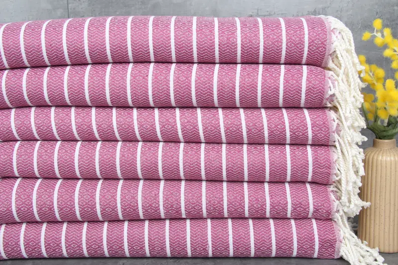 The towels are constructed from 100% organic Turkish cotton, ensuring their softness and durability. Characterized by high absorbency, these towels' fibers become more absorbent with each wash, enhancing their utility. Their dimensions are 40x71 inches or 100x180 centimeters, with a weight of 300 grams, allowing for versatile use across various settings.