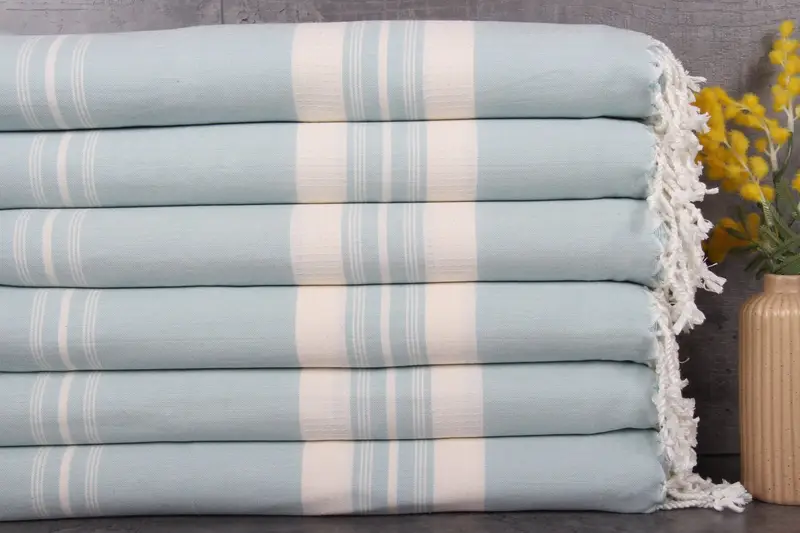 Characterized by their luxurious material, the Turkish Towels are woven from 100% organic Turkish cotton, ensuring a high-quality and naturally soft texture. Resulting in superior absorbency, these towels absorb more water with each wash, enhancing their utility over time. Measuring 38x60 inches or 95x150 centimeters, each piece weighs approximately 250 grams, with hand-weaving tolerances of 1-2.5 cm.