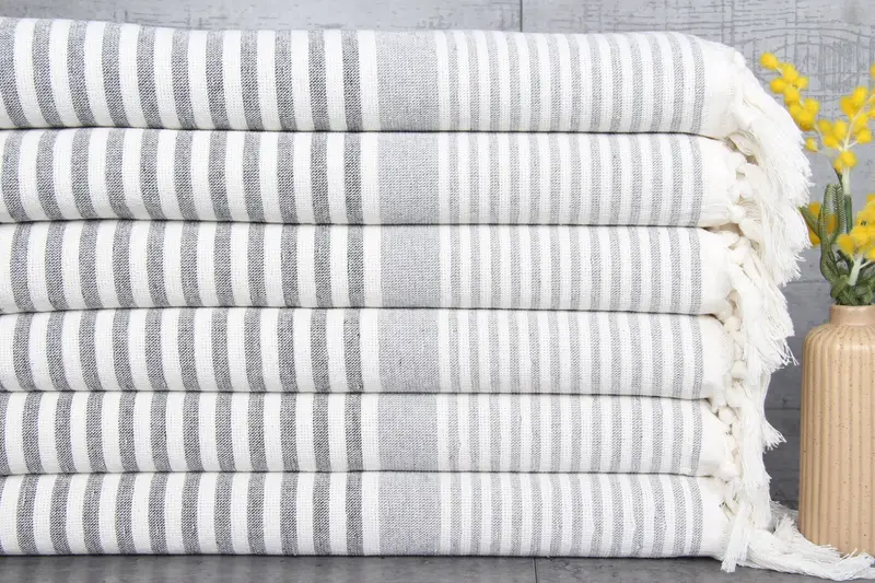 Composed exclusively of 100% organic Turkish cotton, the towels ensure exceptional breathability and superior absorbency. Characterized by natural dyeing, these towels require separate washing for initial 2-3 cycles followed by machine washing at 30-40°C. The towels, weighing 108 grams, come in dimensions of 18x36 inches (45x90 centimeters) and feature hand-weaving tolerances of 1-2.5 cm.