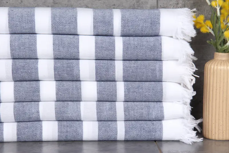 The Turkish towels are made of 100% organic Turkish cotton, ensuring natural dyeing and enhanced absorbency. Characterized by their 40x63 inches (100x160 cm) dimensions and a weight of 200 grams, these towels display minimal hand-weaving tolerances of 1-2.5 cm.