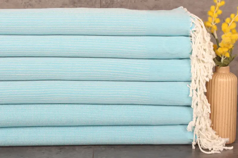 The beach towel is characterized by its 100% organic Turkish cotton composition, ensuring both sustainability and superior absorbency. These towels exhibit a weight of 320 grams, with dimensions of 38x71 inches (95x180 centimeters), providing ample coverage. The handmade nature of the towels results in slight variations of up to 1-2.5 cm, adhering to traditional weaving practices.