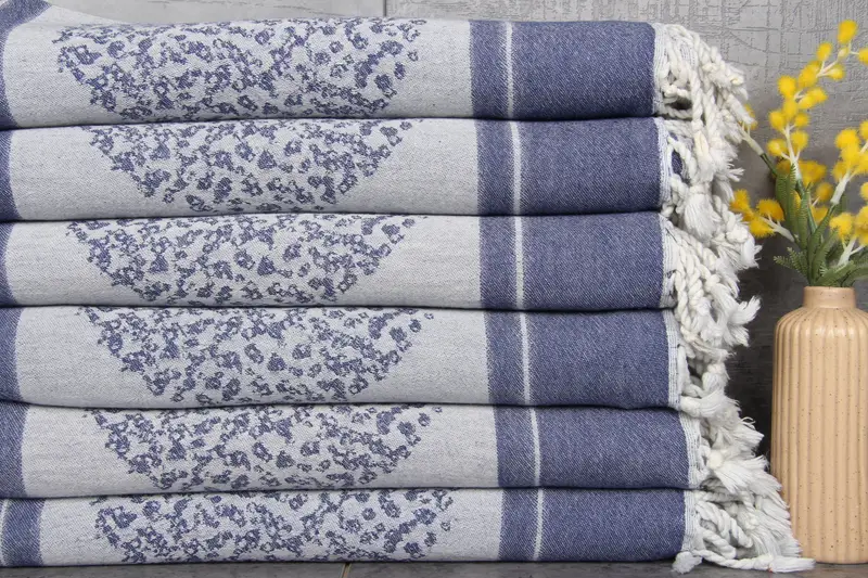 These beach towels, blankets, and hand towels are composed entirely of 100% organic Turkish cotton, ensuring a soft texture and high absorbency. Characterized by dimensions of 38x60 inches or 95x150 centimeters, they weigh 250 grams. The hand-weaving process allows for slight variations of 1-2.5 cm.