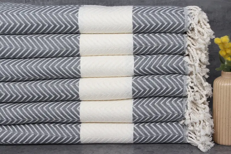 The Turkish Towels, crafted from 100% Organic Turkish Cotton, ensure a naturally dyed aesthetic. These towels, characterized by their exceptional absorbency, result from hand-weaving techniques that allow for tolerances of 1-2.5cm. Each towel, weighing 414 grams and measuring 40x71 inches (100x180 centimeters), is pre-shrunk to maintain durability.