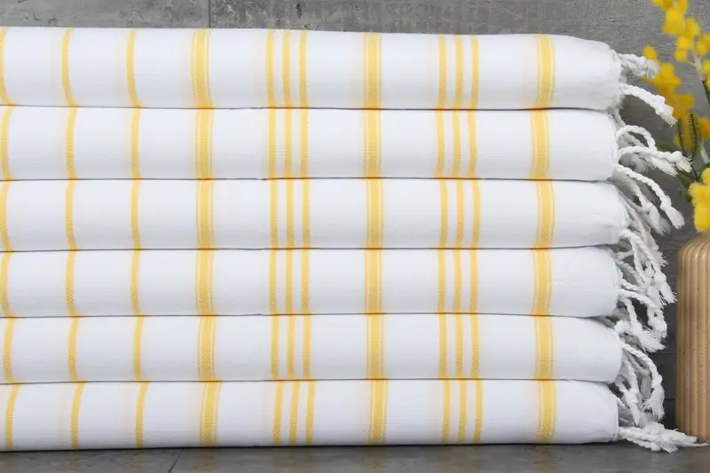Constructed from 100% organic Turkish cotton, these towels are characterized by their natural dyeing process, ensuring durability and vibrant colors. The towels measure 24x36 inches or 60x90 centimeters, with a weight of 100 grams per square meter, providing a balance between lightweight comfort and robust functionality. Each piece is hand-woven, allowing for slight dimensional tolerances within 1-2.5 centimeters.