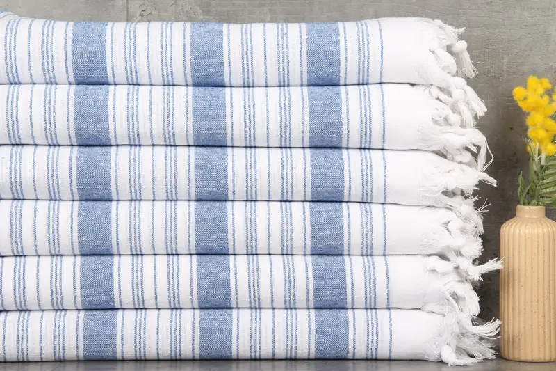 Turkish Towels, made from 100% organic Turkish cotton, ensure superior absorbency, resulting in effective water absorption with each wash. Characterized by dimensions of 32x67 inches (80x170 centimeters) and a weight of 260 grams, these towels exhibit hand-weaving tolerances of 1-2.5 centimeters.